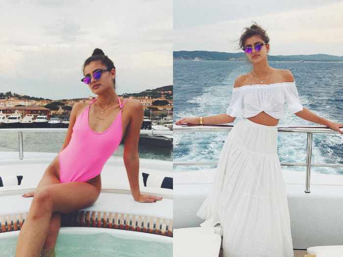 Victoria's Secret model Taylor Hill, maintained her tan on the beach of Saint Tropez. The 21-year-old star gave us a sneak peak of her getaway on a yacht in a one-piece Baywatch style baby pink bikini!