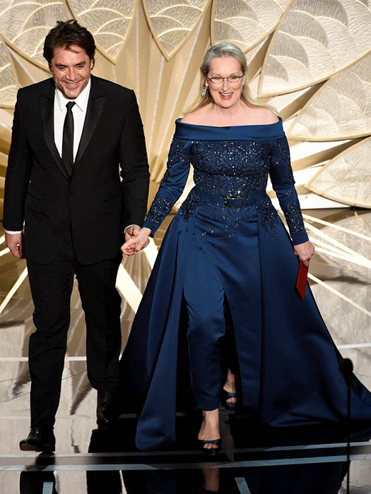 Meryl Streep opted for an off-the-shoulder dark blue dress by Elie Saab… We couldn’t think of a better choice!