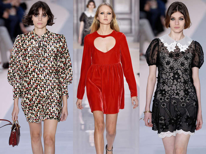 Valentino’s dresses celebrate romanticism with floral embroidery on sheer tulle, lots of red and delicate black beads.