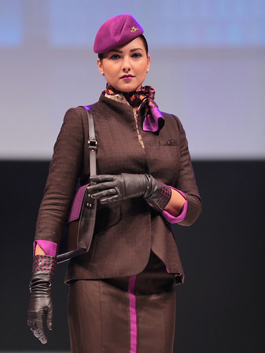 The Etihad Airlines uniform is to die for. The collection was designed by Ettore Bilotta in 2014. The women who work for the airline agency get to wear a chocolate-brown skirt suit with fitted long brown diamond texture gloves, a belt, slim line handbag and stunning Parisian scarf. Cabin Managers wear a bright Magenta hat, whereas the rest of the crew opts for a brown one. Male flight attendants show up in a fitted grey three-piece suit accessorized with a belt, leather gloves and a golden orange neck tie.
