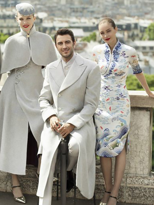 Hainan Airlines debuted the latest collection just last month, in June 2017. The collection designed by Laurence Xu Haute Couture was first launched during the Paris Couture Week Fall/Winter collection 2017. These beautiful uniforms are a combination of modern cuts and traditional Eastern and Western designs. Women opt for a white and blue dress which is similar to the traditional Chinese dress called 'cheongsam', and they can get warm in a slim-cut grey jacket or a below-the-knee grey coat. Men's uniforms are however completely grey; a grey shirt, grey trousers and a grey coat or jacket.