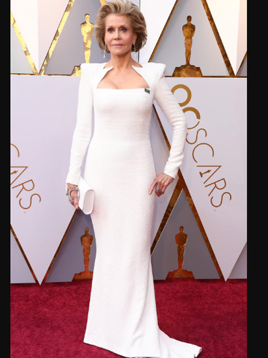 Major fashion moment: Jane Fonda in an all-white, curve hugging Balmain gown. It’s hard to believe she’s in her 80s.