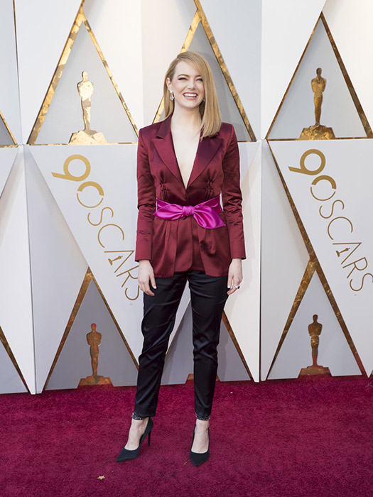 Emma Stone was absolutely ravishing in a sexy burgundy satin blazer by Louis Vuitton.