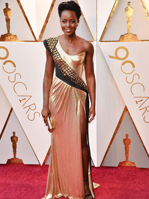 Lupita Nyong'o was literally dripping in gold on the red carpet event. She showed up sporting a black and gold Versace number with a very high leg slit.