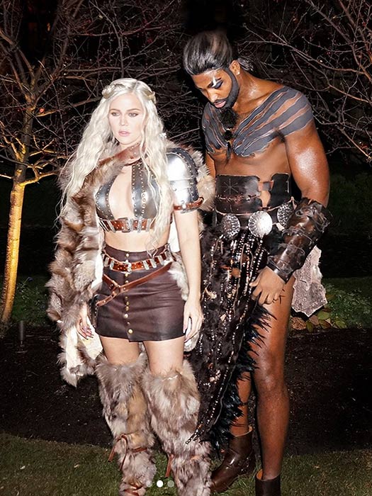 Khloe Kardashian showed her love for Game of Thrones this weekend by going as Daenerys Targaryen, and since she and Tristan Thompson are practically inseparable, the NBA player also showed up wearing a GOT costume; he went as the one and only Khal Drogo. The custom-made medieval outfits were designed by Bryan Hearns. Genius!