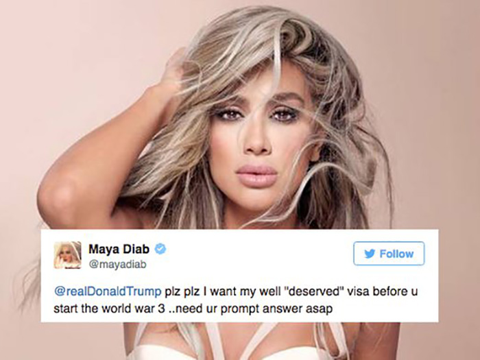 This fearless move was done by Lebanese singer Maya Diab. The star live tweeted Trump during the Lebanese MTV show ‘Menna w Jerr’ to jokingly ask him to grant her a US visa before he starts World War III. “@realDonaldTrump plz plz I want my well ‘deserved’ visa before you start the world war III… Need your prompt answer ASAP.”