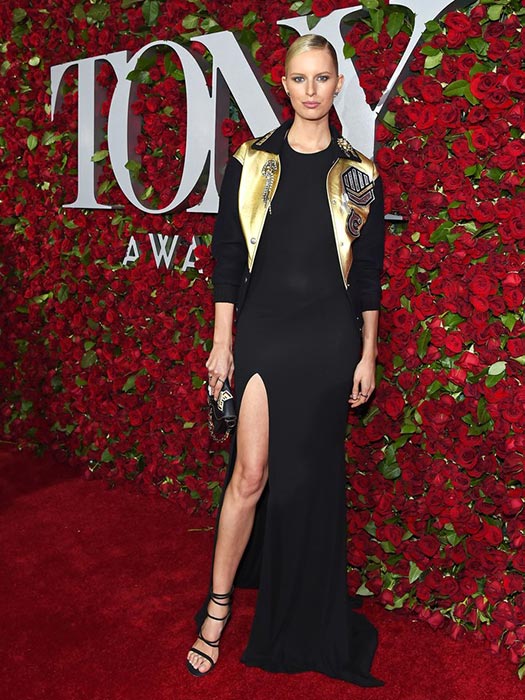 Karolina Kurkova turned heads as she made her appearance in a Coach 1941 dress with a sensual thigh-high slit and Erickson Beamon pins.