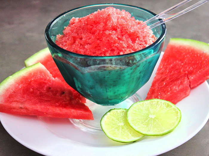 Cut the watermelon into cubes and remove the seeds. Pour the watermelon chunks in a blender and mix until mashed (add sugar if watermelon is not quite sweet in your taste). Pour into a large dish and place in the freezer for 4 hours, while scraping the surface every hour in order to get the slush. To serve, pour the slush into small glasses.