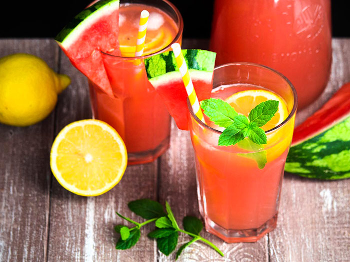 1 watermelon | 200g of caster sugar | 3 glasses of water | 1 glass of lemon juice | Ice cubes