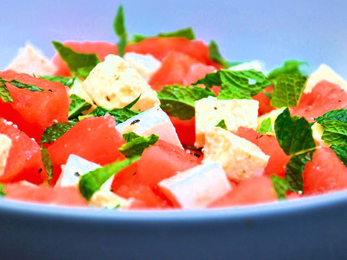 Cut watermelon and feta into cubes. Pour into a bowl, sprinkle with fresh mint and spray with olive oil.