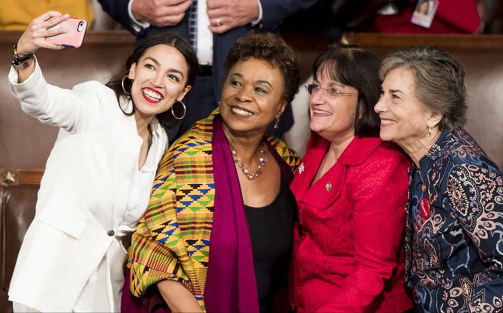 The youngest memeber Ocasio-Cortez wore a white pantsuit that evoked homages to both the Facebook group Pantsuit Nation and Hillary Clinton’s signature pantsuits on the presidential campaign trail, in addition to the American Suffragettes, who wore white in their marches for women’s right to vote.