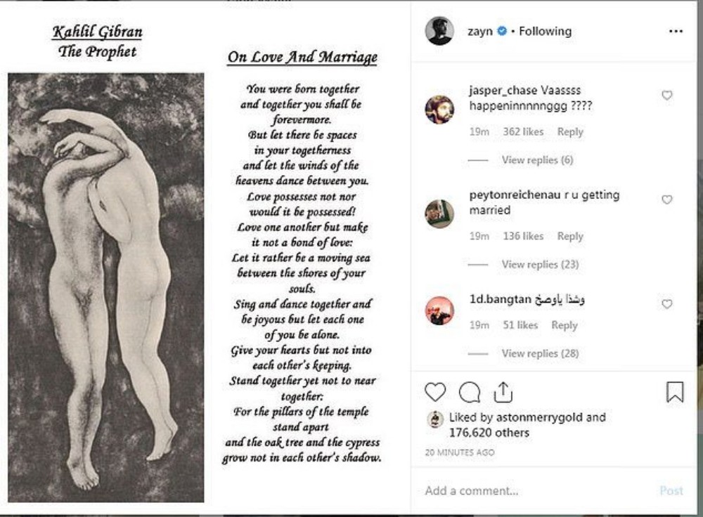 The One Direction star, 26, shared an image on Instagram that showed a sketch of a couple alongside a lengthy quote from Gebran Khalil Gebran’s “The Prophet”. The singer was reported to have split from girlfriend Gigi Hadid after a two year on and off again relationship last January. The pair previously announced a breakup on Twitter within minutes of each other in March 2018. Shortly after Gigi and Zayn publicly revealed their split, he had multiple tattoos applied in the span of a week, including the number 25 - his age then - on his neck.